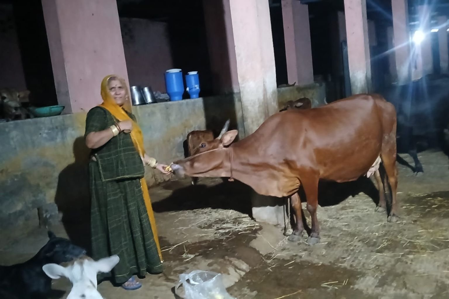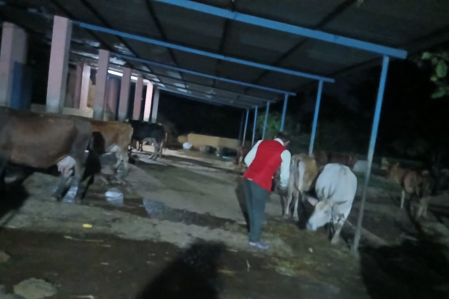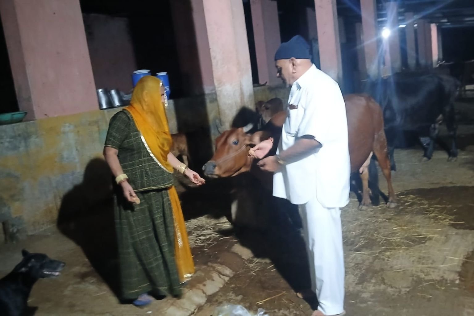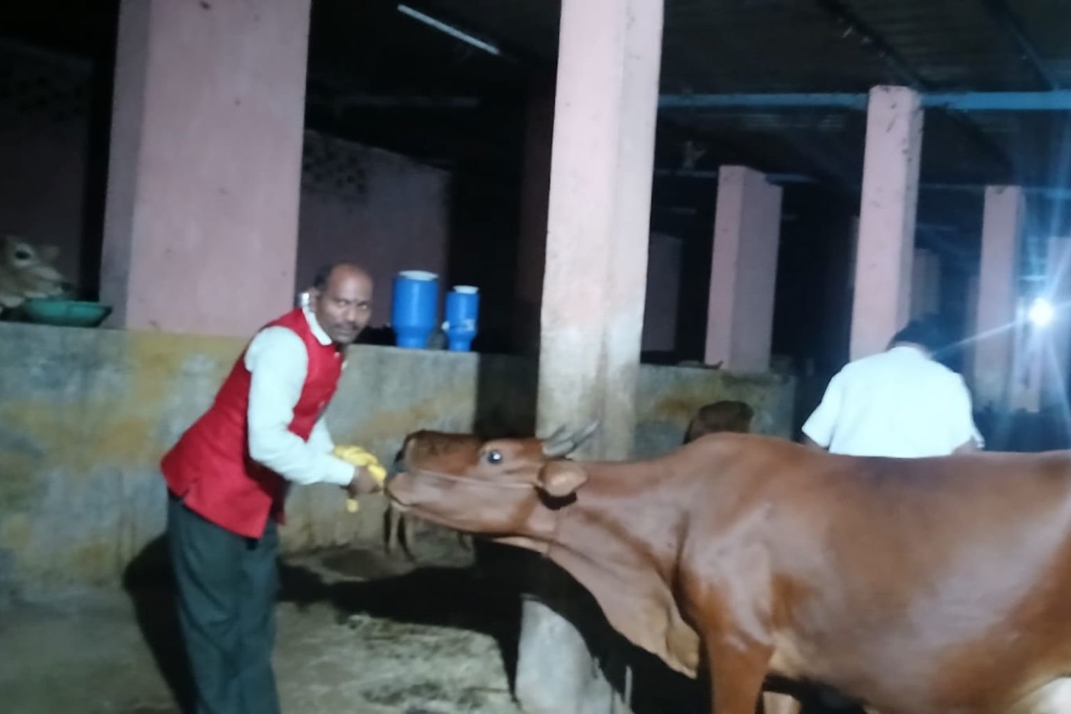 Acharya Rajendra, founder of Ragasia Cheritable Trust, along with his parents, feeding Jaggery And Bananas to Cows In a Cowshed.