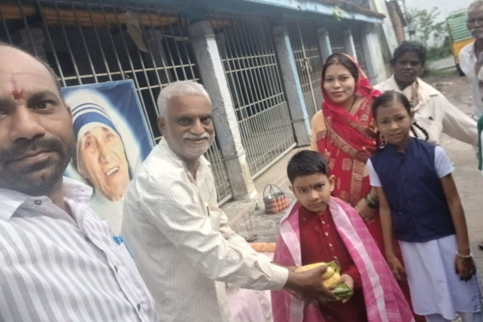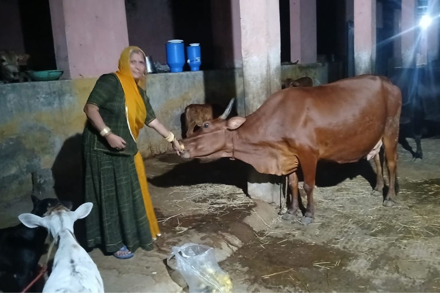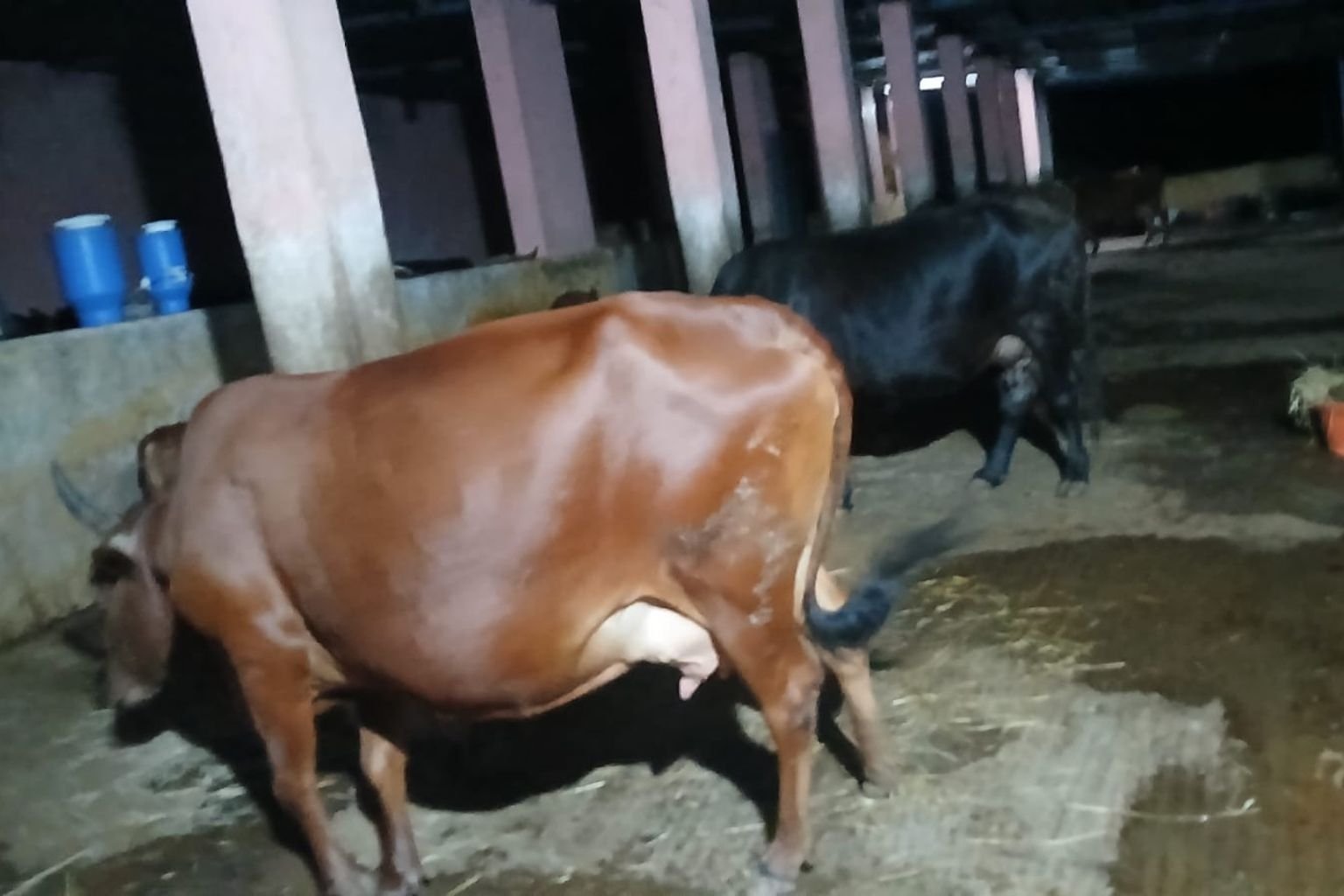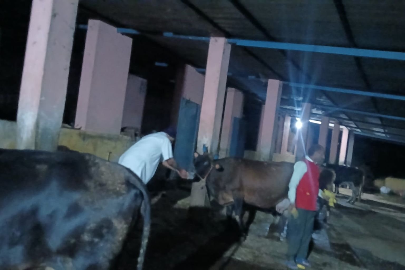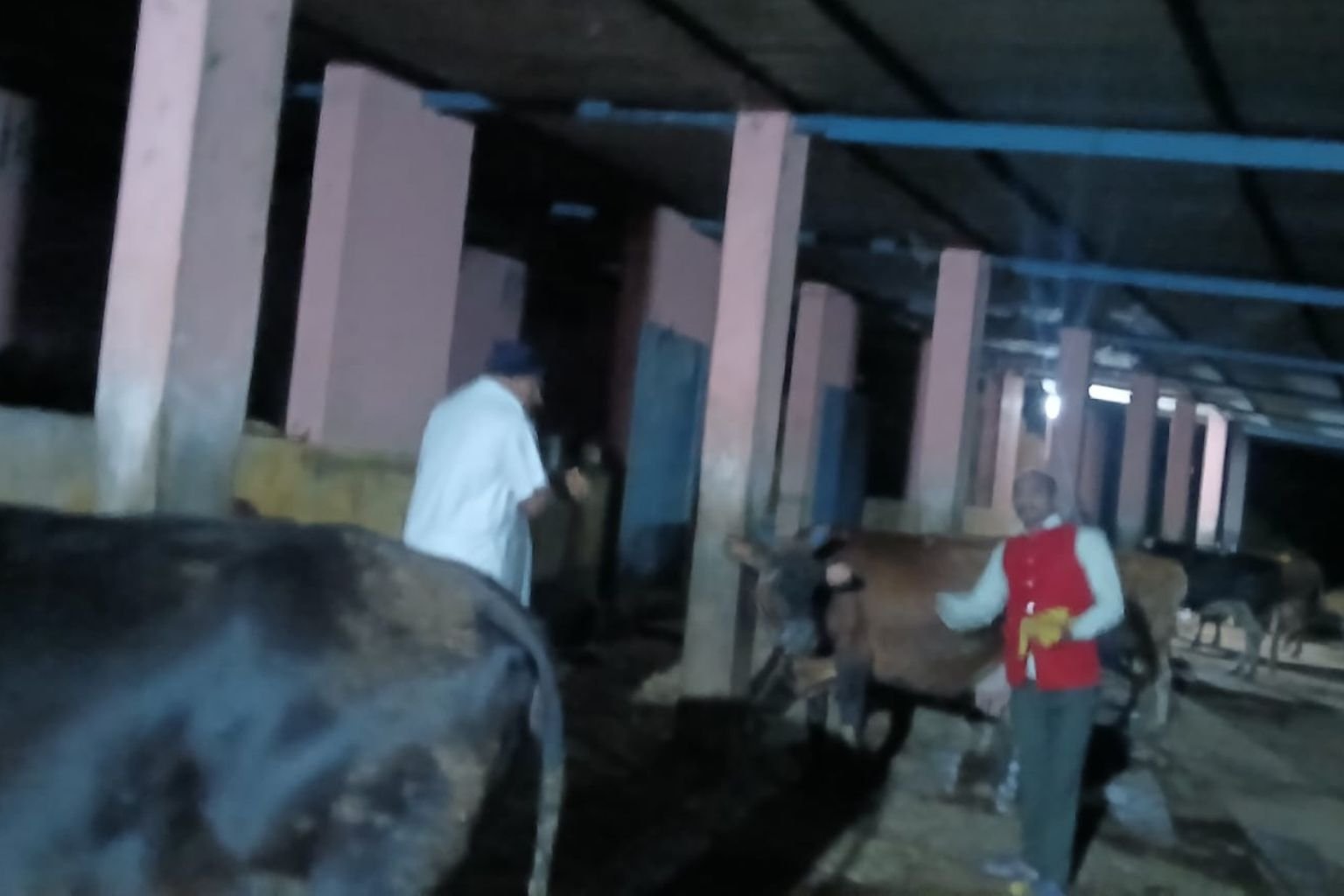 Acharya Rajendra, founder of Ragasia Cheritable Trust, along with his parents, feeding Jaggery And Bananas to Cows In a Cowshed.
